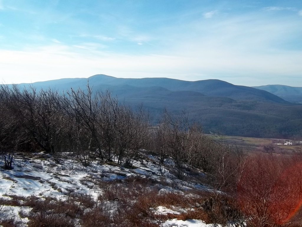 This is one of several clear views to the northwest from the ridge. Mt. Raimer and Berlin Mountain are clearly visible. North Adams and Williamstown are in the valley. The north end of the Mt. Greylock complex is in the foreground on the left.